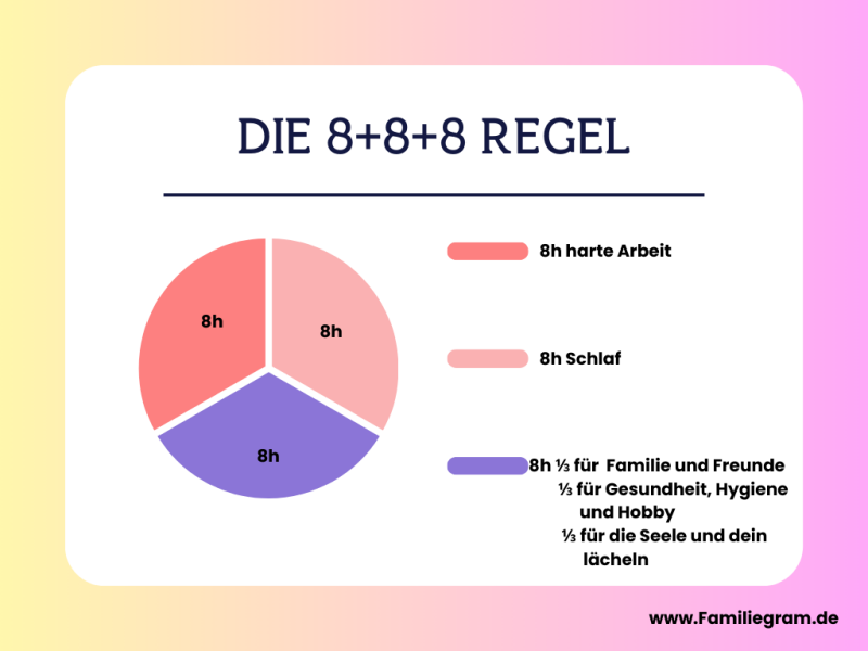 Die 8+8+8-Regel ist wie ein unsichtbarer Personal Trainer für dein Leben – freundlich, strukturiert und ohne Muskelkater. Sie zeigt dir: Ein Tag hat genug Zeit für alles Wichtige, wenn du’s dir bewusst einteilst.